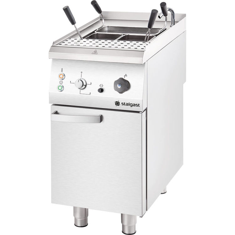 Gemelli, Spaghetti oder Fussili - alle Nudelsorten finden ihren Platz in dem großen Wasserbecken und können sich beim Kochvorgang bestens entfalten für Pasta "alla Mamma"! Zuvor füllen Sie das Becken über den rückseitigen Wasserzulauf mit Magnetventil bequem auf und erhitzen das Wasser, was dank der 6 kW besonders schnell zu kochen beginnt. Die Heizstäben finden sich, geschützt durch eine Abstellfläche für die Nudelkörbe, am Beckenboden. Die Bauweise aus hochwertigem Edelstahl macht die Heizstäbe beständig gegen Hitze und Salz. Die Steuervorrichtungen und Kontrollleuchten finden sich übersichtlich angeordnet auf dem anwenderfreundlich schräggestellten Bedienelement. Sie können zwei 1/3 oder bis zu vier 1/6- Nudelkörbe einsetzen, um die gewünschte Pasta portions- und sortenweise zu kochen. Die Körbe können Sie nach dem Kochvorgang auf der gelochten Abstellfläche bis zum Anrichten abtropfen lassen. Über den Wasserzulauf füllen Sie jederzeit verdampftes Kochwasser nach. Am Ende des Arbeitstage oder falls Zwischendurch erforderlich, können Sie das Wasser über den Ablauf schnell und einfach ablassen. Das Ablassventil befindet sich leicht zugänglich im Unterschrank hinter der doppelseitigen Tür mit Magnetschließer. Der schmale Pastakocher aus Edelstahl der Serie 700 ND ist die optimale Lösung für Ihr Restaurant, nicht nur zum Kochen von Nudeln; Auch das Zubereiten von Gemüse, Reis, Kartoffeln oder Fisch wird zum Kinderspiel! Die Oberfläche und das Wasserbecken lassen sich schnell hygienisch säubern. Sie können das Gerät einzeln aufstellen oder in Ihre Kochstrecke integrieren.