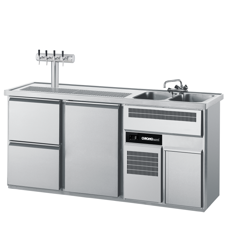 GETRÄNKETHEKE GN 1/1, 2 BECKEN RECHTS, 2 ZÜGE 1/2, 1 TÜR. Abdeckung (50 mm) aus CNS 18/10, schalldämmend unterfüttert, allseits abgekantet, mit Wulstrand, Tropfmulde mit Ablauf und herausnehmbaren Abtropfblechen. 2 nahtlos eingeschweißte Becken inklusive 1 Ablaufverbindung mit Siphon und je 1 Standrohr 1 1/4'' mit Ventilsitz. Kühlkorpus in einem Stück hochdruckgeschäumt, innen und bedienseits außen aus Edelstahl, Rückseite und Seiten aus verzinktem Stahlblech. Maschinenfach aus Edelstahl. SteckerfertigeUmluftkühlung mit spezialbeschichtetem Mittelverdampfer, automatischer Abtauung, Tauwasserverdunstung und elektronischer Regelung mit Digitalanzeige. Kältemaschine für Servicezwecke beweglich montiert. Maschinenfachblende zur einfachen Kondensatorreinigung ohne Werkzeug demontierbar. Flügeltür und Schubladenschilder jeweils in einem Stück hochdruckgeschäumt, mit integrierter Griffleiste und leicht auswechselbarer Magnet-Dichtung. Schubladen mit Teleskopauszügen aus Edelstahl, Nutzhöhe je 344 mm. 1 kippsichers höhenverstellbares U-Auflageschienenpaar, 1 rilsanierter Tragrost und 4 Schubladen-Trennstäbe als Zubehör. 2 Sockelprofile 40 mm hoch, jeweils längs vorn und hinten montiert. Lieferung erfolgt ohne Zapfsäule, Mischbatterie und Lochbohrungen. Mischbatterie als Mehrpreis erhältlich. Temperaturbereich +2 / +12 °C. Anschlusswert 440 W / 230 V / 50 Hz. Kältemittel R290. Kälteleistung 440 W -10 °C VT / +32 °C UT. Energieverbrauch 1,9 kWh/24h. Becken 300 x 500 x 300 mm. Abmessungen unverpackt (LxTxH) 1950 x 700 x 980 mm.