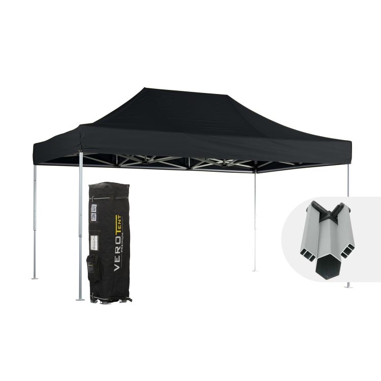 Leichtes HEX Alu Faltzelt 3x4,5m mit Dach. 100% wasserdicht. Seitenteile, vollflächiger Druck und viel Zubehör optional. Stabiles, einfaches Zeltgestell; kann von nur einer Person getragen werden. Ideal für die gelegentliche Verwendung zB als Marktzelt. Aufbau in wenigen Minuten mit dem roten Schnapper, Höhe 4-fach verstellbar. Zeltgestell: Hexagon 40mm Standbeine aus eloxiertem Aluminium mit einer Wandstärke von 1mm. Nylonverbinder in planenschonendem Design. Sämtliche Ersatzteile verfügbar. Einfache Reparatur, da sämtliche Teile verschraubt sind. Dach und Seitenteile aus dem Premium Material Supratex 600D. Dieses High-Tech Material besteht aus fünf Schichten, unter anderem eine PU-Beschichtung. An dieser perlt Wasser einfach ab, das Dach wird abwischbar und einfach zu reinigen. 100% wasserdicht, auch bei langem und starkem Regen, durch versiegelte Nähte mit Spezialband und hochwertige Verarbeitung. Zeltdach aus durchgefärbtem Faden mit UV-Stabilisierung für lange Farbechtheit. Sonnenschutz 50+. Scheuerschutz-Verstärkungen an allen wichtigen Stellen für lange Nutzungsdauer der Zeltplane. Gute Verbindung Dach-Zeltgestell mit starken Klettverschlüssen. Inklusive Premium Tragetasche. Guter Schutz für den Faltpavillon inkl. Dach durch PVC-verstärkte Ecken. Zelt muss zur Montage nicht angehoben werden. Laschen unter dem Gestell verhindern Herausrutschen. Optimierte Lastverteilung durch umlaufende Gurten. Bequeme, gummierte Griffe. Inklusive Abspannungs- und Verankerungsset bestehend aus Heringen und Seilen. Optional erhältlich: Seitenteile, Gewichte aus Stahl, mit Sand oder Wasser, Ankerlösungen und Faltpavillon Zubehör wie Seitenteile, Beach-Flags, Beleuchtung, die immer am Gestell bleiben kann, vollflächiger Druck uvm. Gestell: Aluminium eloxiert- 4 Standbeine - Durchgangshöhe 1,70 - 2 m - Hexagon-Aluminiumsteher 40mm x 1,0mm Wandstärke - Nylonverbinder in schwarz, alle verschraubt - Aufbau mit dem einfachen roten Schnapper - Metallfußplatte verschraubt - Scherenprofil 13x26mm, Wandstärke 1,0mm, mit 2 Stützrippen - Ersatzteile erhältlich Dach: Premium Material Supratex, Polyester 600D- Aufbau aus 5 Schichten, inkl. PU Beschichtung- 100% wasserdicht- versiegelte Nähte- UV stabilisiert 50+- brandhemmend nach Norm EN13501-1, Klasse B-s1,d0- abwischbar- beidseitig bedruckbar