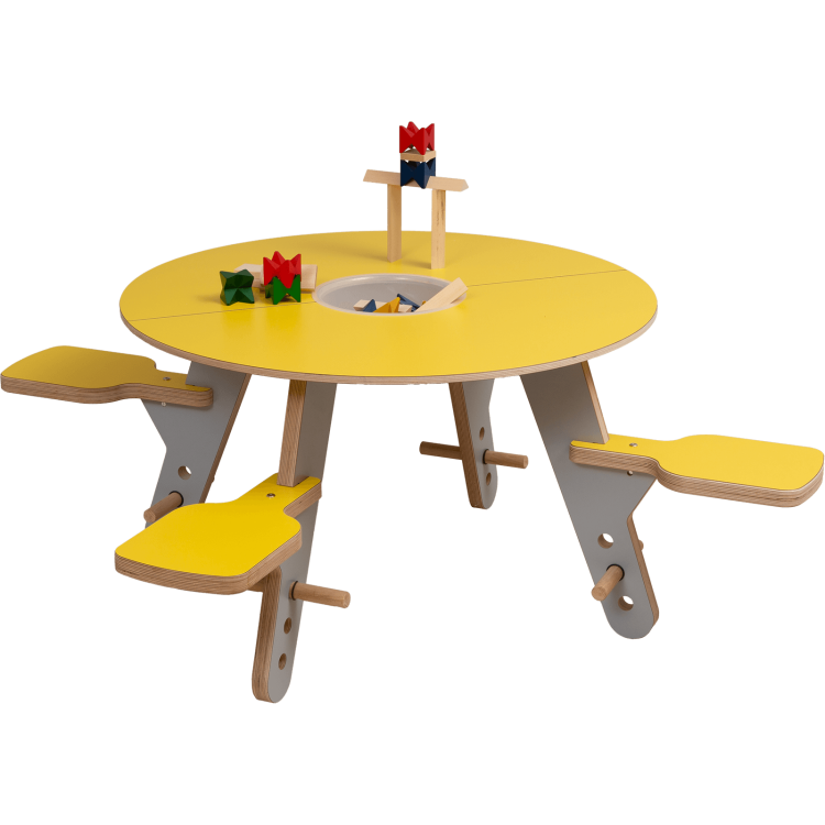 Die vier Sitzgelegenheiten dieses Spieltisches sind direkt am Holzgestell angebracht und bieten durch die stabile Tisch-Sitzkombination besonders kleineren Kindern große Sicherheit. So sitzen die kleinen Kreativen fest am runden Tisch, in dessen Mitte Becher für Malstifte oder eine Schale für Spielzeug eingelassen werden können – ein variables Kindermöbel mit Kippelsicherung!