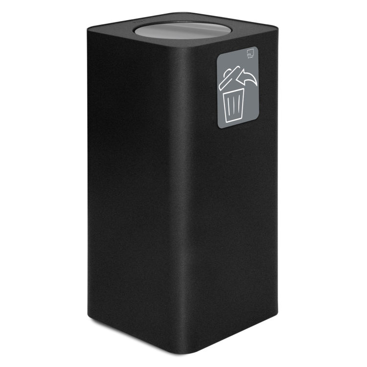 Eleganter und funktioneller Behälter für die Abfallsammlung in Innenräumen, ganz aus schwarz lackiertem Stahl, Deckel mit Kippdeckel aus poliertem Stahl. Der Einwurf der Säcke erfolgt über einen umlaufenden Ring aus Technopolymer mit Sackverriegelungsfunktion und verzinkter Verriegelungsstange. Magnetisches Piktogramm mit dem Symbol "undifferenziert", leicht an der Vorderseite des Behälters anzubringen und zur gründlichen Reinigung zu entfernen. Bodenschonende Technopolymer-Füße