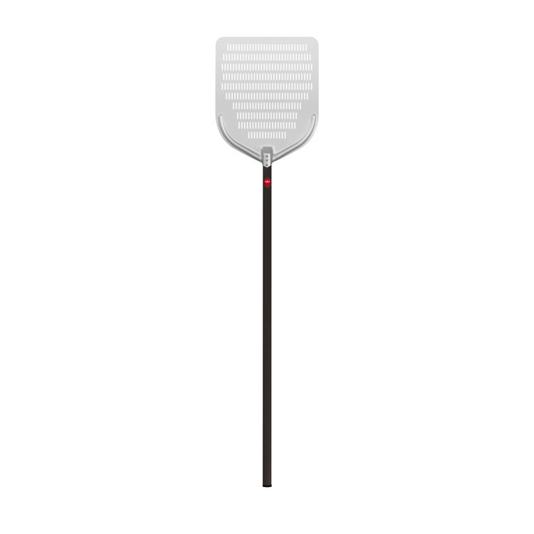 Gepfefferte Pizzaschaufel aus eloxiertem Aluminium, Größe 32 cm, Schaufelstärke 2 mm. Die Perforationen lassen das Mehl abfließen und sorgen für einen sauberen Ofen. Schwarzer Aluminiumgriff. Praktisch und leicht, um die Kontrolle und Sicherheit bei der Handhabung der Pizza während des Backens zu ermöglichen, ein wesentliches Element in Pizzerien und Restaurants. Der lange Stiel bietet einen bequemen Griff für eine einfache und sichere Handhabung der Schaufel.