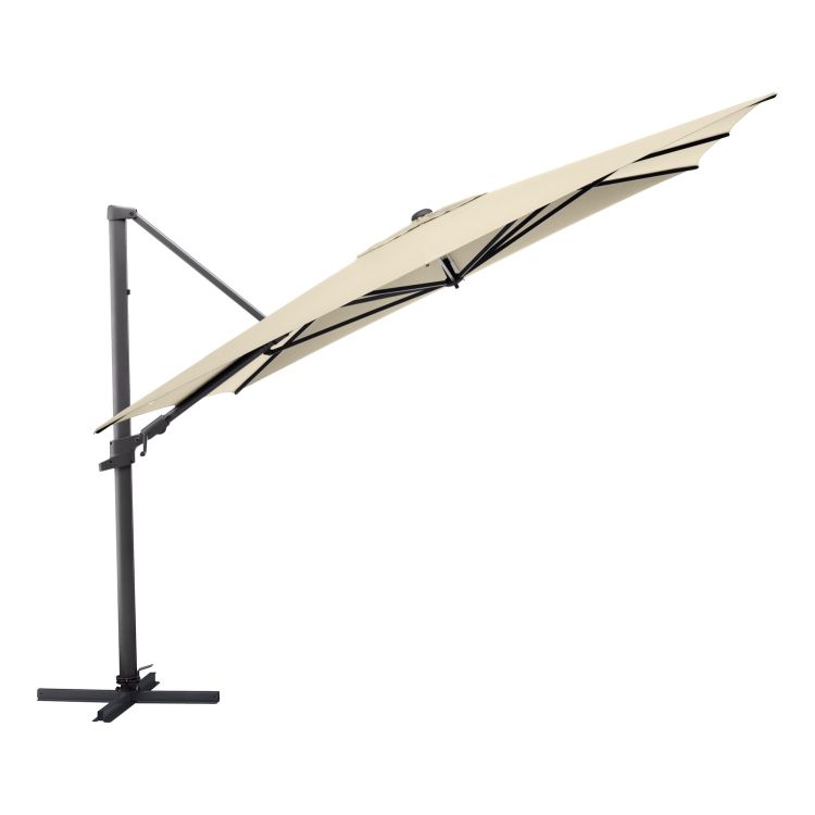 Der Ampelschirn EASY FLEX lässt sich mit Hilfe der Kurbel aus Zink-Druckguss sehr leicht neigen, kippen und drehen. 360° drehbar, 80° neigbar, 45° beidseitig kippbar und somit sehr gute Beschattung über den gesamten Tag ohne den Schirm verschieben zu müssen. Auswechselbarer Schirmbezug aus 100% Polyester 220 g/m² mit Lichtschutzfaktor 50+ nach australisch/neuseeländischem Standard S/NZS4399:1996. Aluminiumgestell pulverbeschichtet, Edelstahlverschraubungen. Fußtritt aus stabilem Aluminium-Druckguss, sehr stabile Streben ca. 26 x 18 mm. Vormontiert, sehr leichte Endmontage mit nur 6 Schrauben. Inklusive Abdeckhaube und Schirmständer für Wegeplatten 50 x 50 x 5 cm (Lieferung ohne Platten). Bis Windstärke 4 lt. Beaufortskala benutzbar.