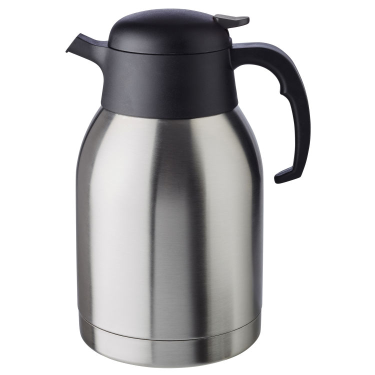 Isolierkanne -CLASSIC- Ø 14 cm, H: 25 cm, 2 Liter Edelstahl, Polypropylen doppelwandig Einhandautomatik Drehverschluss für heiße und kalte Getränke Innendurchmesser = 8,5 cm für 16 Tassen