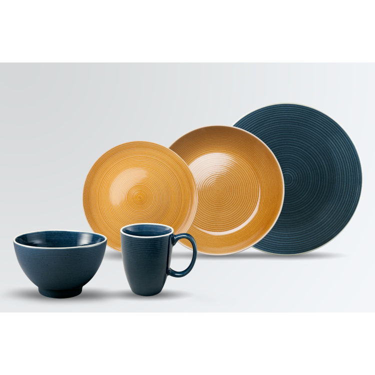 Das Set für vier Personen besteht aus jeweils vier Tellern flach Ø 21 cm (braun) und Ø 28 cm (blau), Tellern tief Ø 24 cm (braun), Schalen ØxH 15,5x9,5 cm (blau) und Becher 0,34 l (blau). Farbige Steingut-Serie mit spiralenförmiger Farbstruktur. Farbabweichungen möglich