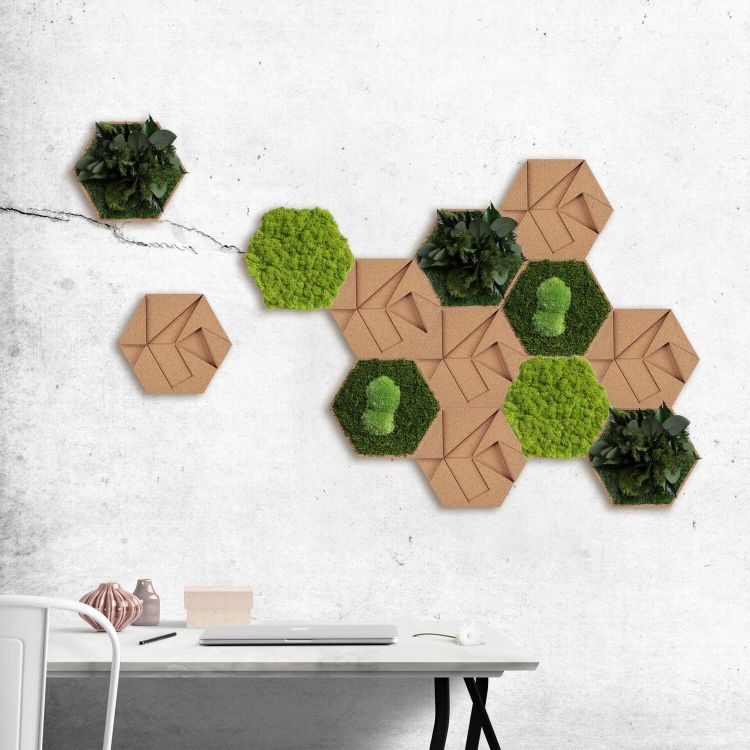 Unser Designer?! Die Natur! Deshalb schauen wir genau hin und nutzen die besonderen Formen und Farben auch für unsere Produkte. Bienenwaben sind ein architektonisches Wunder und dieses Wunder holen wir in Ihre Räume! Unser styleGREEN Kork-Hexagon Set besteht aus 25 einzelnen Korkfliesen - stylischer Kork in Kombination mit Hexagonen aus hochwertigen Moosen und Pflanzen. Lassen Sie Ihrer Kreativität freien Lauf und ordnen Sie die Wandelemente ganz nach Ihren Wünschen und den räumlichen Gegebenheiten an. Und ganz nebenbei: das Kork-Hexagon 25er Set wirkt sich positiv auf das Raumklima aus und weist einen natürlichen Schallschutz Effekt auf.
