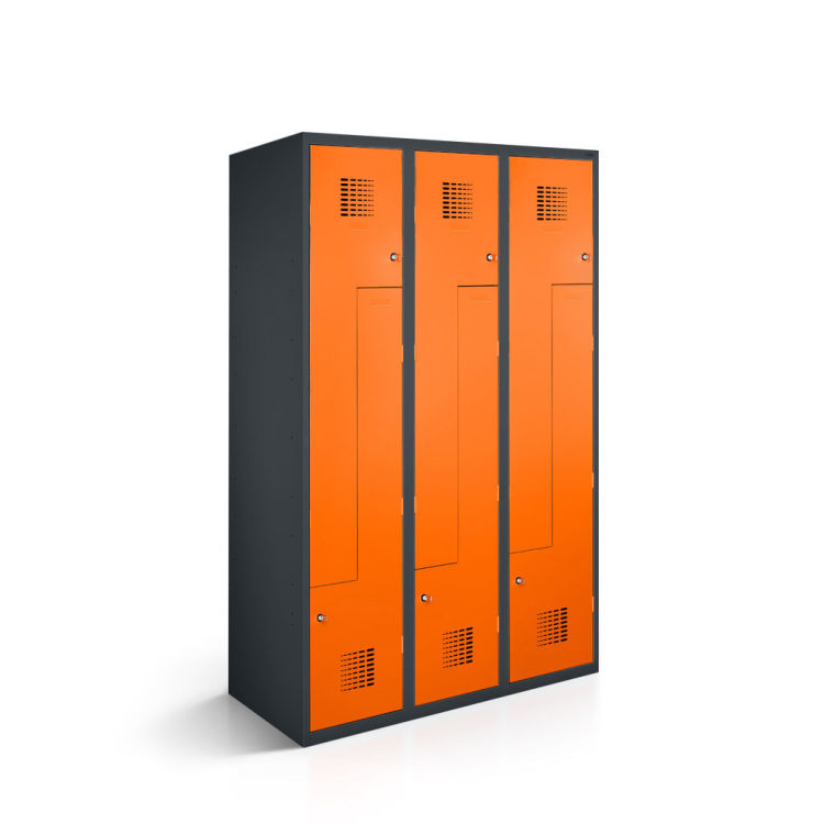Der Korpus und die Türen bestehen aus 0,5 mm dickem, pulverbeschichtetem Qualitätsfeinblech. Abgerundete Kanten sorgen für Sicherheit. Die verstärkten, glatt einliegenden Türen sind mit Gummipuffern und kräftigen Drehbolzen (110° Öffnungswinkel) ausgestattet. Der Z-Spind ist in verschiedenen Farben und Ausstattungsvarianten erhältlich, um Ihren Ansprüchen gerecht zu werden.