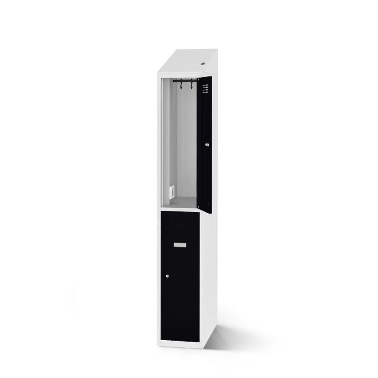 Der Garderobenspind von rotstahl® ist die optimale Lösung, wenn Sie begrenzten Platz haben, aber dennoch viel Stauraum für Ihre Kunden oder Mitarbeiter benötigen. Mit zwei übereinander angeordneten Abteilen, jeder ausgestattet mit einer stabilen Kleiderstange und verschiebbaren Haken, bietet er effiziente Aufbewahrungsmöglichkeiten.