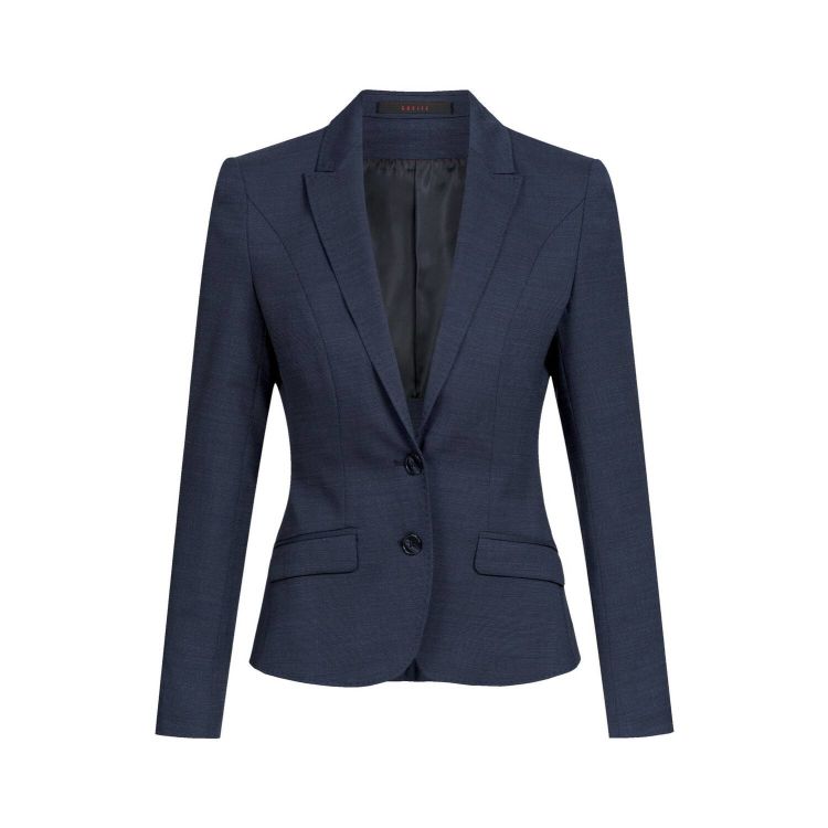 2-Knopf, Spitzfacon, 2 Pattentaschen, 1 Reißverschluss-Innentasche, AMF-Handstich, Rückenschlitz, halbgefüttert, 52 % Polyester, 46 % Schurwolle, 2 % Elasthan