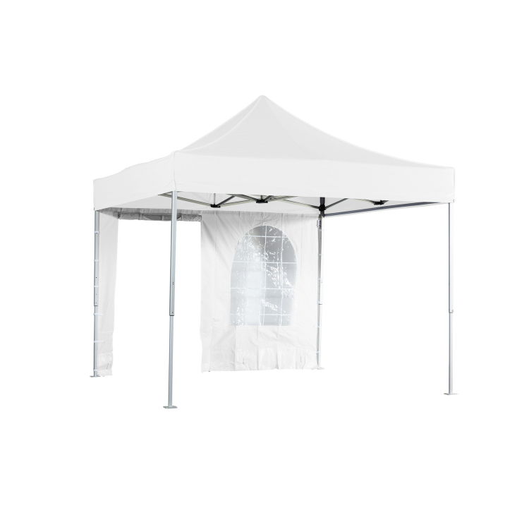 3m Seitenteil mit French Window und Türe zum Aufrollen. Mit Zippsystem und Zugschlaufen.Hohe Schmutztoleranz des Fensters, da der Blick durch die Sprossen abgelenkt wird. Türe beidseitig mit Zip zu öffnen. Transparenter Teil aus hochwertigem PVC. Planenmaterial Supratex 600D, wie Dach. Befestigung an der Dachblende mit breitem Klett. Befestigung am Zeltgestell mit Zugschlaufen für Spannung auch bei schräg stehenden Standbeinen. Verbindung von zwei Seitenwänden durch Reißverschluss möglich – schnell, winddicht und für durchgehende Druckmotive.Ideal für längere Standzeiten auf Terrassen und Co, wenn das gesamte Faltzelt geschlossen werden soll. 100% wasserdicht. UV stabilisiert 50+. Brandhemmend nach EN13501-1, Klasse B-s1,d0 (Euronorm für B1). Abwischbar. Beidseitig bedruckbar. Inkl. Tragetasche