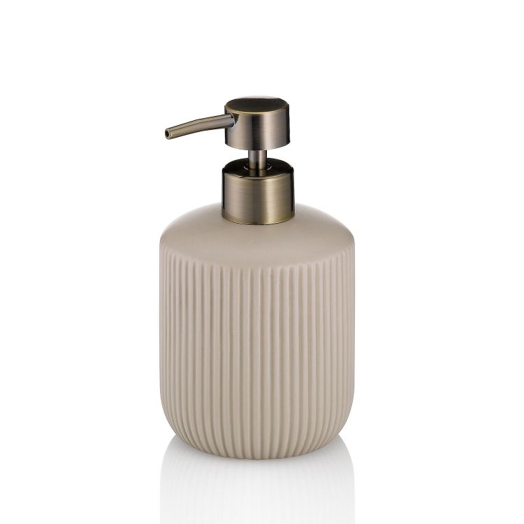 Seifenspender Adele, mit einer Gold verchromten Kunststoffpumpe, in der Farbe Offwhite. Der Seifenspender hat eine Rillen Struktur aus Keramik.Das elegante Aussehen passt in nahezu jedes Badezimmer. Maße: 15,5 cm Ø, 9 cm h und ein Fassungsvermögen von 400 ml.