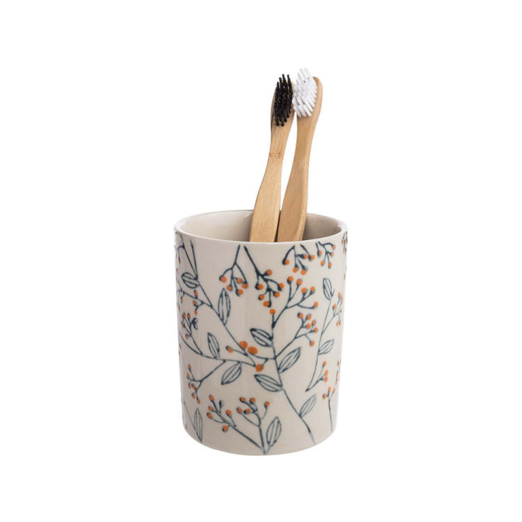 Der beste Platz für die Zahnbürsten: Der handgefertigte Becher aus hochwertigem Steingut überzeugt nicht nur mit seinem filigranen, handgestempelten Muster, sondern vor allem mit seiner Funktionalität. Der Zahnbürstenhalter bietet Platz für gleich mehrere Zahnbürsten und sorgt dafür, dass diese im Badezimmer ordentlich untergebracht sind. Der stilvolle Halter kann aber auch für andere Utensilien oder sogar Blumen verwendet werden! Ein wunderschönes Accessoire für Bad, Küche, Flur und mehr. H 10 cm.