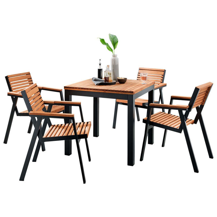 Hochwertige Verarbeitung und ein klares, zeitloses Design: Das 5-teilige Gartenmöbel-Set "Berrissimo" ist perfekt für Balkon, Terrasse oder Garten. Es besteht aus 4 Gartenstühlen mit Armlehnen und einem quadratischen Gartentisch, der auch perfekt auf kleinere Flächen passt und dennoch genug Platz für Essen, Getränke und Kerzen bietet. Somit ist für den gemütlichen Nachmittag mit Freunden bei sonnigem Wetter gesorgt. Das stabile Aluminium bietet mit seiner schwarz gepulverten Oberfläche einen angenehmen Kontrast zum natürlichen Robinienholz, das aus nachhaltiger, FSC-zertifizierter Forstwirtschaft stammt. Durch die Behandlung mit einer speziellen Lasur ist das Set wetterfest und kann das ganze Jahr über draußen gelassen werden. Möchte man die Stühle doch mal verstauen, können sie platzsparend übereinander gestapelt werden (max. 4 Stück). Herstellung in Europa.
