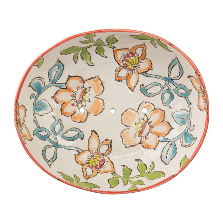 Mit dieser Seifenschale genießt man zu jeder Jahreszeit einen Hauch von Sommer! Das handgestempelte Blumenmotiv ist immer wieder hübsch anzusehen und sorgt für gute Laune. Dank der Herstellung aus Steingut hat die Schale mit praktischen Ablauflöchern eine langlebige, robuste Qualität. B 13 x T 11 x H 4 cm.