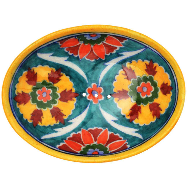 Die wunderschöne Seifenschale in ovaler Form ist ein echter Hingucker im Badezimmer. Die Schale wird nach traditioneller Töpferkunst in Indien von Hand bemalt und begeistert mit ihrer farbenfrohen Qualität. Das Beste: Jede Seifenschale ist ein echtes Unikat! Die Herstellung dieser außergewöhnlichen Serie sichert den Menschen in der indischen Manufaktur die Lebensgrundlage. B 13 x T 9 x H 2 cm.