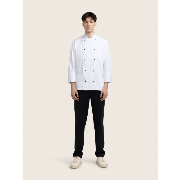 Ein Klassiker für jede Küche: Unsere langarm Kochjacke RUBANO aus leichtem, weichem Mischgewebe bietet viel Bewegungsfreiheit und den perfekten Schutz während der täglichen Arbeit. Die klassische zweireihige Knopfleiste wird mit verschiedenen Kugelknöpfen zum optischen Hingucker. Der Schürzenbandhalter im Nacken und die zweifächerige Brusttasche bieten die küchenorientierten Details, die ihr von unseren Designs kennt. Vier Lüftungslöcher unter jedem Arm sorgen für ein angenehmes Körperklima, auch in heißen Küchen. Mit diesem Klassiker bist du bestens ausgerüstet und kannst alles schaffen. Let’s change Workwear!