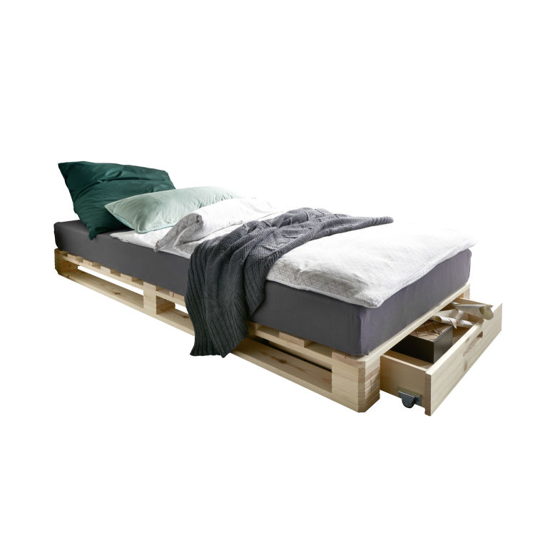 Mehr als nur ein Schlafplatz: dieses Massivholzbett in zeitlosem Stil verbindet durch das hochwertige Kiefernholz aus Lettland ein Stück Natur mit praktischer Funktionalität in Form eines Schubkastens für zusätzlichen Stauraum. Das moderne Paletten-Design mit unbehandeltem Holz bringt einen urbanen Look ins Schlafzimmer und ist mit einer Liegefläche von 90 x 200 cm perfekt für eine Person geeignet. Das hochwertige Kiefernholz fördert mit seiner feuchtigkeitsregulierenden Wirkungen ein angenehmes Schlafklima und durch die FSC-Zertifizierung trägt dieses Bett zu einer nachhaltigen Forstwirtschaft bei. Gestaltet und gefertigt wurde das niedrige Bettgestell in einer kleinen Manufaktur in Europa und ist dank des robusten Kiefernholzes extrem langlebig. Besonders toll am naturbelassenen Kiefernholz: wenn es ganz frisch ist, verströmt es einen angenehmen Duft nach Baumharz!