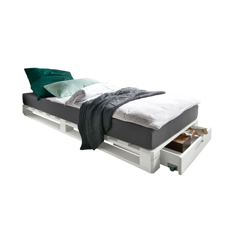 Mehr als nur ein Schlafplatz: dieses Massivholzbett in zeitlosem Stil verbindet durch das hochwertige Kiefernholz aus Lettland ein Stück Natur mit praktischer Funktionalität in Form eines Schubkastens für zusätzlichen Stauraum. Das moderne Paletten-Design mit weiß lackiertem Holz bringt einen urbanen Look ins Schlafzimmer und ist mit einer Liegefläche von 90 x 200 cm perfekt für eine Person geeignet. Durch die FSC-Zertifizierung trägt dieses Bett zu einer nachhaltigen Forstwirtschaft bei. Gestaltet und gefertigt wurde das niedrige Bettgestell in einer kleinen Manufaktur in Europa und ist dank des robusten Kiefernholzes extrem langlebig.