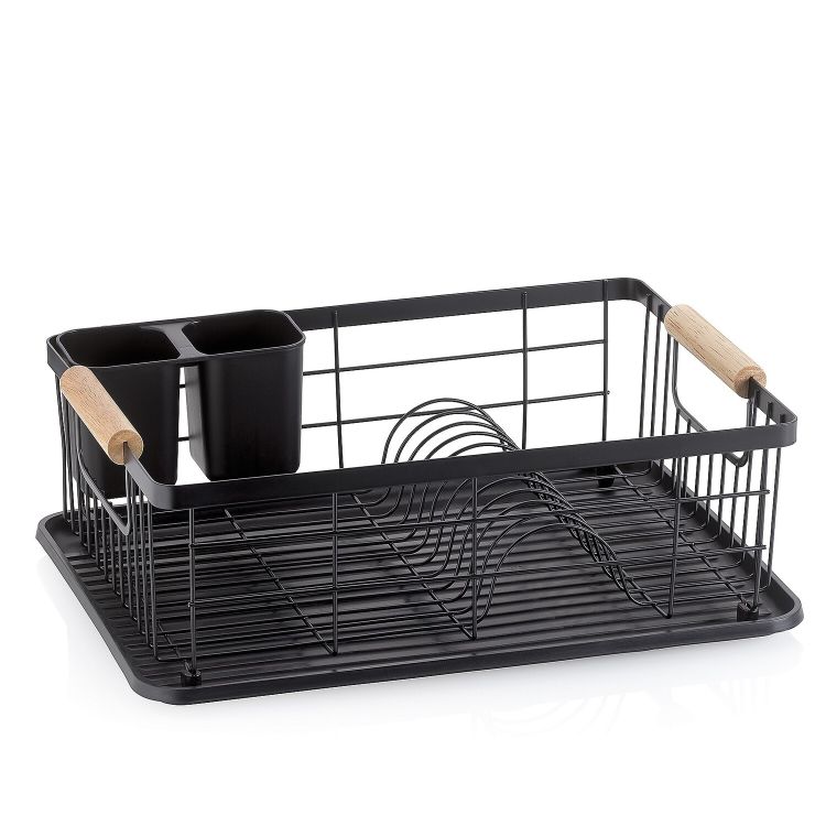 Schöner, schwarzer Geschirrabtropfkorb Rica aus Metall inklusive Kunststoffsteller für das sich sammelnde Abtropfwasser und 2 Besteckhalter aus Kunststoff. Ideales Accessoire, um das Geschirr praktisch an der Luft trocknen zu lassen. Maße: 35 x 28 x 13 cm.