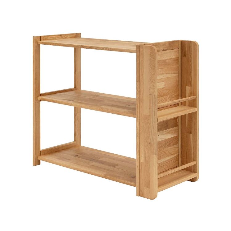 Dieses offene Regal ist nach dem Montessori-Prinzip entwickelt: Die Selbstständigkeit und Kreativität von Kindern wird ganz spielerisch gefördert. Die niedrige Höhe der drei Fachböden ermöglicht es, dass Kinder das Regal selbstständig einräumen. Sie entscheiden selbst, wo Spielzeug, Lernmaterialien und mehr stehen. Das stärkt auch ihren Ordnungssinn. Seitlich ist ein Bücherregal integriert, sodass Kinder ihre Lieblingsbücher wie in einer eigenen kleinen Bibliothek präsentieren können. Das Montessori-Kinderregal ist perfekt, um Kindern die Möglichkeit zu geben, ihre Umgebung aktiv mitzugestalten. Durch die Herstellung aus massivem Holz hat das Regal eine besonders robuste, langlebige Qualität. Zur Auswahl stehen Buche, Wildeiche oder Buche weiß. B 90 x T 38 x H 75 cm.