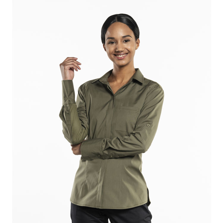 Ein weicher. knitterfreier Stoff mit bequemer Passform: Das macht Arbeit in dieser Kellnerbluse so angenehm. Durch den Stretchanteil passt sie sich problemlos den Bewegungen des Körpers an. Der glatte. gewebte Stoff strahlt Qualität aus. Eine Besonderheit dieser Bluse ist die luftige Rückseite aus Jerseystoff. Diese schwarze Damenbluse ist antailliert und hat eine verdeckte Knopfleiste.