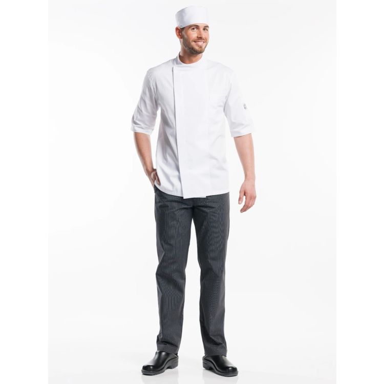 Die Regular Fit-Hose hat einen geraden Beinverlauf und sitzt komfortabel auf der Hüfte. Ein flottes und modernes Modell. Die Kochhose ist im Rücken mit einem Elastikeinsatz versehen, was zusätzlichen Komfort bietet. Zudem verfügt die Hose über Gürtelschlaufen und einen knopf.Der graue Farbton und die leichten Streifen der Livio sorgen für einen subtilen, aber dennoch stilvollen Auftritt.