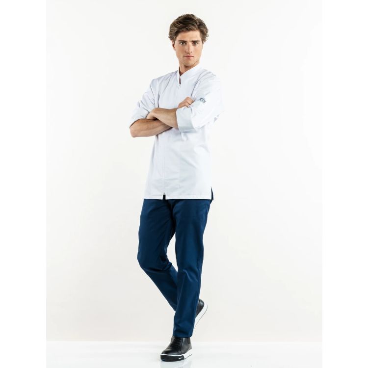 Die Regular Fit-Hose hat einen geraden Beinverlauf und sitzt komfortabel auf der Hüfte. Ein flottes und modernes Modell. Die Kochhose ist im Rücken mit einem Elastikeinsatz versehen, was zusätzlichen Komfort bietet. Zudem verfügt die Hose über Gürtelschlaufen und einen knopf. Die Marino bildet eine perfekte neutrale Basis.