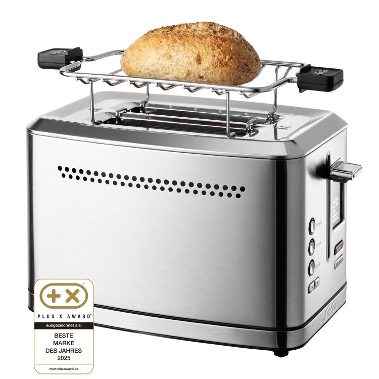 Dieser Grill Toaster verfügt über extra breite Schlitze, die sich ideal für Bagels oder English Muffins bis zu einer Größe von 12 x 13,5 cm eignen. Dank der 7 individuellen Programme können Sie verschiedene Brotsorten wie Weiß- oder Vollkornbrot, Bagels, Waffeln, English Muffins, Zopf und sogar glutenfreies Brot perfekt rösten. Die Auftau- und Aufwärmfunktion ermöglicht es Ihnen, eingefrorene oder kalte Brotscheiben auf die perfekte Temperatur zu bringen, ohne sie zu verkohlen. Das LCD-Display mit Hintergrundbeleuchtung zeigt Ihnen das ausgewählte Programm sowie einen Countdown-Timer für den Toastvorgang an, damit Sie immer im Bilde sind. Mit der Speicherfunktion können Sie bis zu 4 individuelle Einstellungen speichern, um Ihren perfekten Toast jedes Mal zu reproduzieren. Der abnehmbare Brötchenaufsatz ist im Lieferumfang enthalten und ermöglicht es Ihnen, Brötchen oder Croissants mühelos aufzuwärmen. Das Liftsystem sorgt dafür, dass Ihr Toast immer leicht zu entnehmen ist, ohne sich die Finger zu verbrennen. Die automatische Zentrierung stellt sicher, dass Ihr Brot gleichmäßig geröstet wird, egal welche Brotsorte Sie wählen. Die ausziehbare Krümelschublade macht die Reinigung zum Kinderspiel, während das Gehäuse aus hochwertigem Edelstahl dem Toaster Grill eine moderne und langlebige Optik verleiht. Mit einer Leistung von 950 Watt ist der Solis Flex Toaster (Typ 8004) nicht nur leistungsstark, sondern auch energieeffizient. Machen Sie Ihren Morgen mit diesem erstklassigen Toaster zu einem Genuss für alle Sinne.