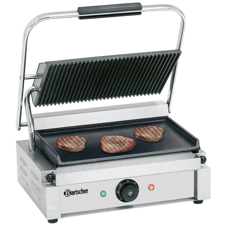 Vielseitig einsetzbarer Kontaktgrill für die schnelle Snack-Zubereitung. Grillplatten aus Gusseisen, oben gerillt, unten glatt. Gehäuse aus Chrom-Nickel-Edelstahl, rostfrei. Thermostat regelbar von 50 ° bis 300 °C. Mit Aufheizkontrollleuchte und Kontrollleuchte Ein/Aus. Inkl. Fettauffangschale aus Chrom-Nickel-Edelstahl, rostfrei und spülmaschinenfest. Inkl. Reinigungsbürste. Zwei Jahre Gewährleistung.