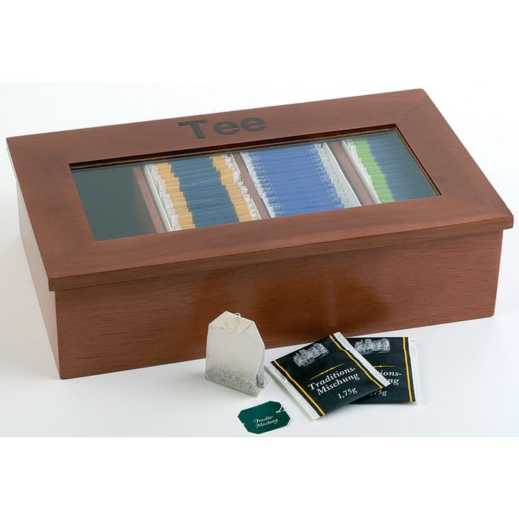 mit Sichtfenster. Die Teebox von APS ist eine hochwertige Holzbox mit Sichtfenster und der Aufschrift Tee. Vier Kammern können mit je 30 kuvertierten Teebeuteln und 12 Kammern mit je 12 Beuteln bestückt werden. Der Deckel bleibt bei Öffnung von alleine offen stehen.