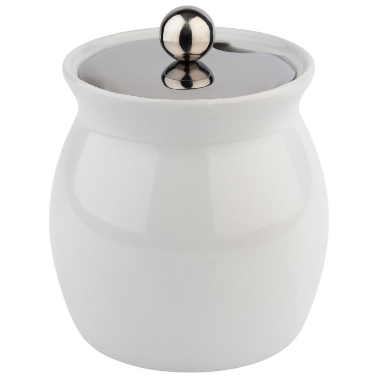 Der Dressingtopf von APS ist aus Porzellan gefertigt und wird mit einem passenden Edelstahl-Deckel geliefert, der über eine Löffelaussparung verfügt.