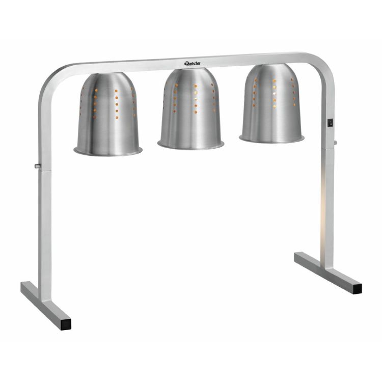 Drei Infrarotlampen mit belüfteten Aluminiumreflektoren sorgen für eine gerichtete Wärmeabgabe. Die Stellfläche ist für Behälter im 2/1 GN-Format ausgelegt und eignet sich für Buffets, Caterings oder Kantinen.