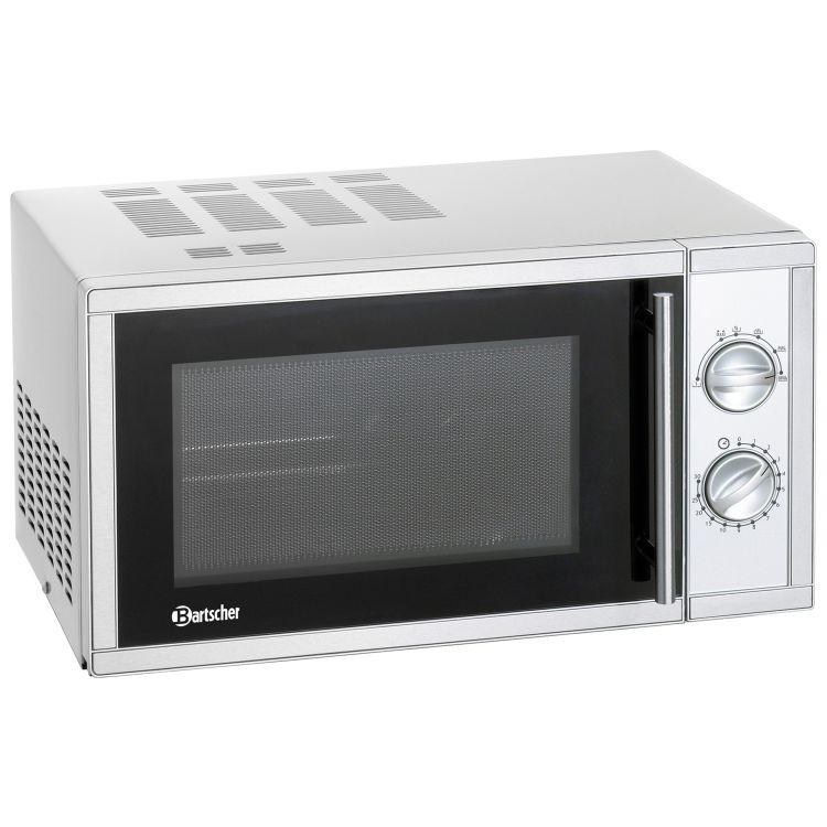 Mikrowellenleistung: 900 W Glasdrehteller Ø 27- cm 6 Leistungsstufen manuelle Zeitschaltuhr bis 30 Minuten Auftaufunktion Innenmaße: 31,5 x 29- x- 20- cm (BxHxT), 23 l 2 Jahre Vollgarantie. Diese hochwertige Mikrowelle von Bartscher verfügt über sechs Leistungsstufen, sowie einer Zeitschaltuhr und einer Auftaufunktion. Das Gehäuse und der Garraum sind aus robustem Edelstahl gefertigt. Dadurch ist das Gerät besonders widerstandsfähig und pflegeleicht.