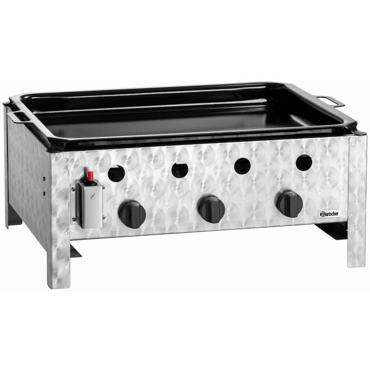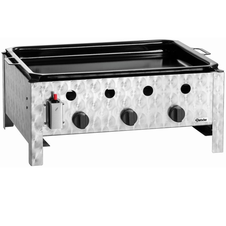 Maße Pfanne 70,5x54x4,3 cm (BxTxH) Flüssiggas mit Piezo-Zündung Anschluss 1/4 Regeldruck 50 mbar / Verbrauch 728 g / Std 3 Gasdüsen-Sets 0,8 mm (30 mbar, 37 mbar, 50 mbar). Der Gas-Tischbräter TB1000PF von Bartscher ist aus robustem Edelstahl mit einer glatten Bratfläche aus emailliertem Stahl gefertigt. Er überzeugt mit drei Brennern mit Piezo-Zündung. Es ist ein praktisches Auftischgerät zum Grillen und Braten mit Gas im Außenbereich. Wichtiger Hinweis: Betrieb nur mit Flüssiggas.