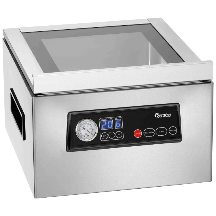 Kammermaße 30,5x32x9 cm 2 Schweißnähte mit Digital-Anzeige Länge Schweißstab 30 cm / Vakuumpumpe 60 L / Min. (ca. 4 m / Std.) Vakuumkontrolle Zeitgesteuert Vakuumierzeit: 20 - 99 Sekunden Druckanzeige durch Manometer Klemmbügel für Vakuumierbeutel Maximales Vakuum -900 mbar Frequenz 50 Hz. Das Vakuumiergerät K 300/60L von Bartscher ist aus langlebigem Edelstahl und robustem Kunststoff gefertigt mit einem modernen Glas-Deckel. Er besticht durch vielzählige Funktionen, das kombinierte Vakuumieren und Versiegeln, manuelles Versiegeln sowie marinieren. Zusätzlich verfügt es über eine elektronische Steuerung. Es ist mit Kontrollleuchten für kombiniertes Vakuumieren und Versiegeln, Versiegeln, Marinieren, Ein/Aus sowie für Abbruch ausgestattet. Die Vakuumierintensität ist regulierbar. Der Lieferumfang enthält 30 Vakuumierbeutel (28x33 cm). Die Schweißdauer ist von 3 bis 9 Sekunden regulierbar.