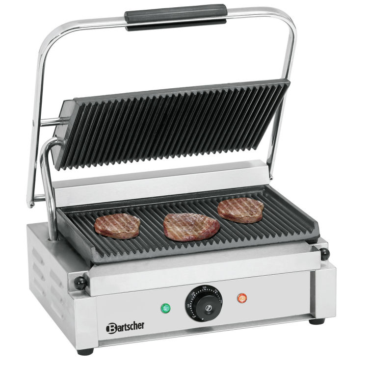 Grillplatten gerillt Aufheizkontrollleuchte stufenlose Regelung 50-300 C Thermostat mit 0-Stellung Maße: Grillplatte oben:B335xT220mmGrillplatte unten:B335xT230mm inkl. 1 Fettauffangschale 1Reinigungsbürste. Der multifunktionale Kontaktgrill Panini ist aus rostfreiem Edelstahl gefertigt und sehr robust. Die Grillplatten aus Gusseisen sorgen für eine optimale Wärmeübertragung und somit für perfekten Grillgenuss.Leckeres, saftiges Fleisch, knackige Würstchen oder knusprige Panini-sandwiches gelingen mit diesem Kontaktgrill im Handumdrehen!