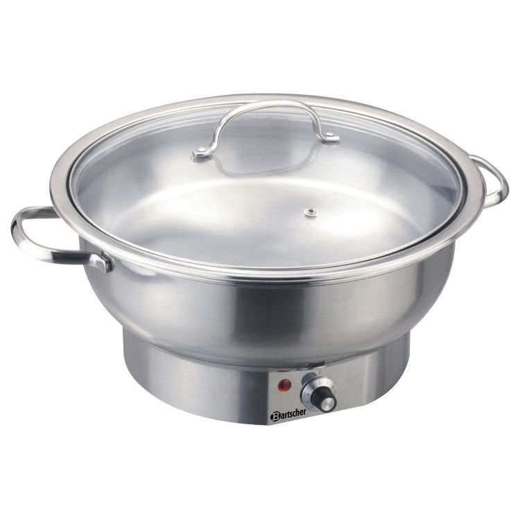 thermostatische Regelung 1-8- Anschlusswert: 500 W / 230 V inklusive Deckel- mit hitzeisolierendem Griff. Dieses runde Chafing Dish aus Chromnickelstahl hilft ihnen ihre Speisen einfach und bequem warm zu halten. Der praktische Glasdeckel ermöglicht es den Inhalt des Behälters zu sehen ohne den Deckel öffnen zu müssen. Die Temperatur kann bequem und einfach in Stufen von 1-8 geregelt werden. Die hitzebeständigen Griffe und das robuste Gestell sorgen für eine sichere Handhabung.