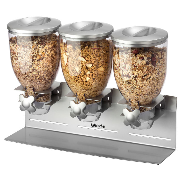 Inhalt: 3 x 3 Liter geeignet für Schalen bis zu 7,5 cm Höhe geeignet zur Wandmontage. Das Gestell des Cerealienspenders von Bartscher ist aus Stahlblech, die Behälter sind aus Kunststoff. Gestell und Behälter lassen sich leicht voneinander trennen, was Ihnen eine einfache Reinigung ermöglicht. Der Cerealienspender ist ideal für Ihr Frühstücksbuffet : Er portioniert krümelfrei die gewünschte Menge durch ein einfaches Drehen. Müsli, Getreide, Cornflakes und Nüsse bleiben so lange frisch und aromatisch !