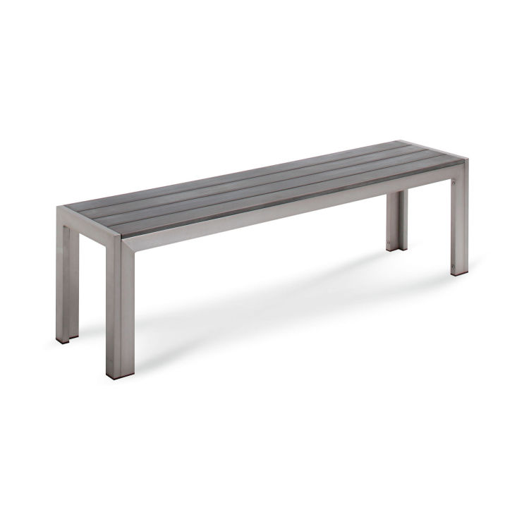 Die schlichte Formensprache prägt das edle Design dieser Bank. Die hochwertige Bank besteht aus einem silberfarbenen, gebürsteten Aluminiumgestell im Edelstahl-Look. Die Sitzfläche besteht aus einer innovativen Lattung aus geformten Aluminiumleisten in anthrazitfarbener Holzoptik. Die Bank ist absolut wetterfest, UV-beständig und pflegeleicht. Maße: 160 x 34 cm / Sitzhöhe: 45 cm
