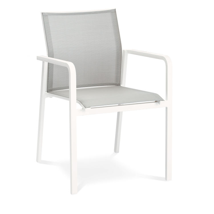 Moderner Stapelsessel mit einem Gestell aus rostfreiem Aluminium. Daher leicht, rostfrei und unkompliziert im Handling. Mit einer strapazierfähigen Oberflächenbespannung aus witterungsbeständigem Ergotex. Der ergonomische Knick der Rückenlehne ergibt ein sehr bequemes Sitzgefühl. Die Sessel sind platzsparend stapelbar und hervorragend für den Objektbereich geeignet. Maße: Gesamtmaß BxTxH in cm: 56x64x85 / Sitzhöhe: 45 cm / Sitzfläche: 44x50 cm / Höhe der Armlehne: 65 cm / Höhe der Rückenlehne: 43 cm
