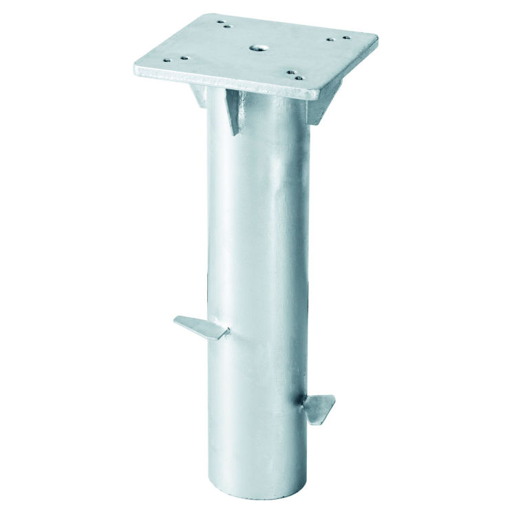 Diese verzinkte Universal-Bodenplatte ist zum Einbetonieren in den Boden. Die Montagefläche beträgt ca. 160 x 160 mm, Gesamthöhe: 42 cm, Mindestabmessungen für das Betonfundament: BxTxH 50x50x50 cm