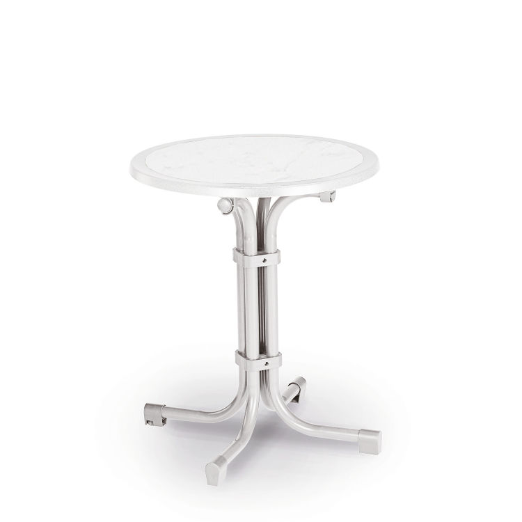 Die extrem strapazierfähige Werzalit-Tischplatte ist absolut wetterfest und pflegeleicht. Sie besitzt eine weiße Oberflächenmarmorierung und hat keine Kanten und Fugen. Die Platte ist kratzfest, hitzebeständig und belastbar. Das stabile und standfeste Stahlrohrgestell mit doppeltem Klappmechanismus und Sicherheitsbügel ist weiß pulverbeschichtet. Mit wenigen Handgriffen wird die Platte abgeklappt und das Fußgestell einfach seitlich eingeschwenkt. Dank der Niveauausgleichsschraube kann die optimale Standfestigkeit auf unebenem Boden eingestellt werden. rund 60 cm Ø / Tischhöhe: 72 cm