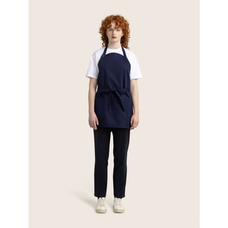 Schürzen sind das wichtigste Arbeitswerkzeug. Küche, Service oder Theke – Hotel, Restaurant, Café oder Bäckerei – die Schürze ist euer täglicher Begleiter. Sie bietet Schutz vor Spritzern und Schmutz und lässt euch bei der Arbeit gut aussehen. Mit unseren kurzen Latzschürzen habt ihr viel Bewegungsfreiheit. In den Taschen lässt sich alles verstauen, was schnell zur Hand sein muss. Die Länge des Latzes ist durch drei Druckknöpfe am Nackenband verstellbar. Mit dieser Schürze könnt ihr alles schaffen – und ihr seid Teil eines innovativen Prozesses. Let´s change Workwear!Material: Köper aus 63% Polyester (recycelt), 35% Baumwolle (Bio), 2% Polyester, 240 g/m²