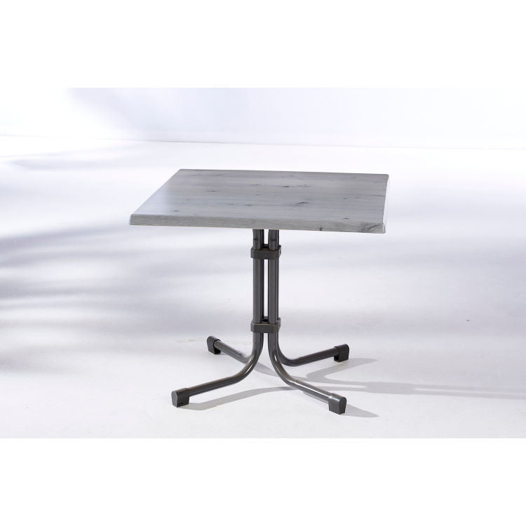 Die extrem strapazierfähige Werzalit-Tischplatte ist absolut wetterfest und pflegeleicht. Sie hat keine Kanten und Fugen. Die Platte ist kratzfest, hitzebeständig und belastbar. Das stabile und standfeste Stahlrohrgestell mit doppeltem Klappmechanismus und Sicherheitsbügel ist anthrazit pulverbeschichtet. Mit wenigen Handgriffen wird die Platte abgeklappt und das Fußgestell einfach seitlich eingeschwenkt. Dank der Niveauausgleichsschraube kann die optimale Standfestigkeit auf unebenem Boden eingestellt werden. quadratisch 80 x 80 cm / Tischhöhe: 72 cm