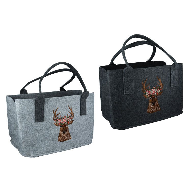 Filz Tasche "Hirschkopf mit Blumenkranz" hellgrau/dunkelgrau, detailliert bestickt 2fach sortiert, Belastbarkeit bis zu 15 kg. Sie erhalten 4 Stück ( 2 x hellgrau / 2 x dunkelgrau )
