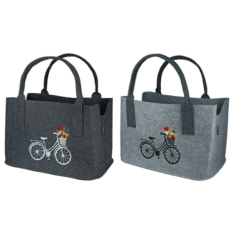 Filz Tasche "Blumenfahrrad" hellgrau/dunkelgrau, mit bunt bestickten Blumen 2fach sortiert
