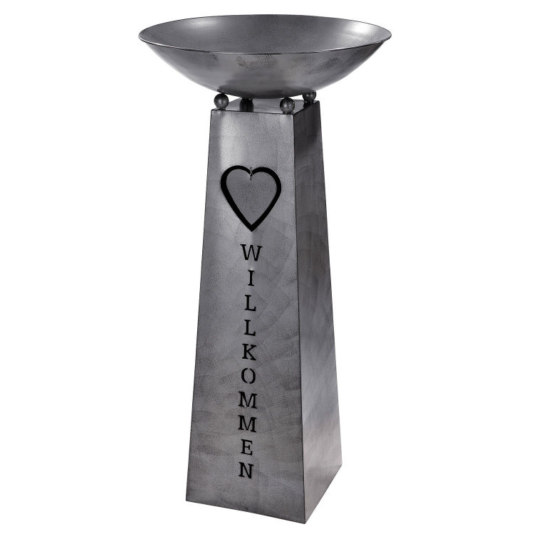 Metall Schalenständer "Willkommen" antik grau, mit hängendem Herzornament bestehend aus Schale + Ständer