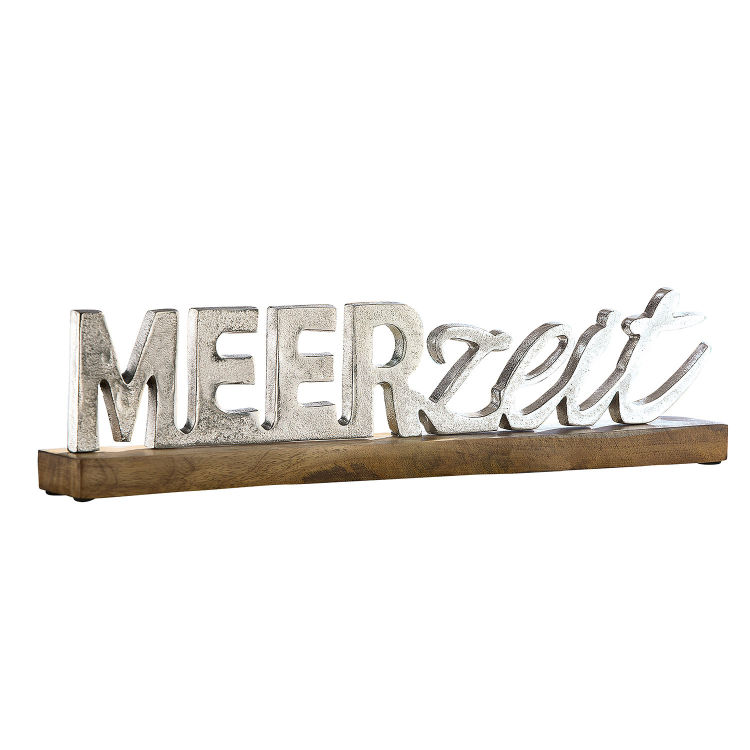 Aluminium Schriftzug "MEERzeit" aus Aluminium silberfarben, auf naturfarbenen Sockel aus Mangoholz