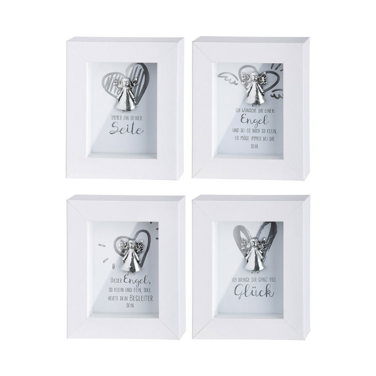 Holz Rahmen Schutzengel mit Botschaft weiß/silberfarben, zum hängen und stellen "Ich wünsche Dir einen Engel und sei er noch so klein, er möge immer bei dir sein", "Dieser Engel so klein und fein, soll heute dein Begleiter sein", "Ich bringe Dir ganz viel Glück", "Immer an Deine Seite"