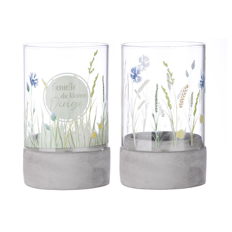 Glas, Zement Windlicht "Wildblumen" klar/grau/grün/gelb/blau "Genieße die kleinen Dinge", Blumenmotiv 2fach sortiert